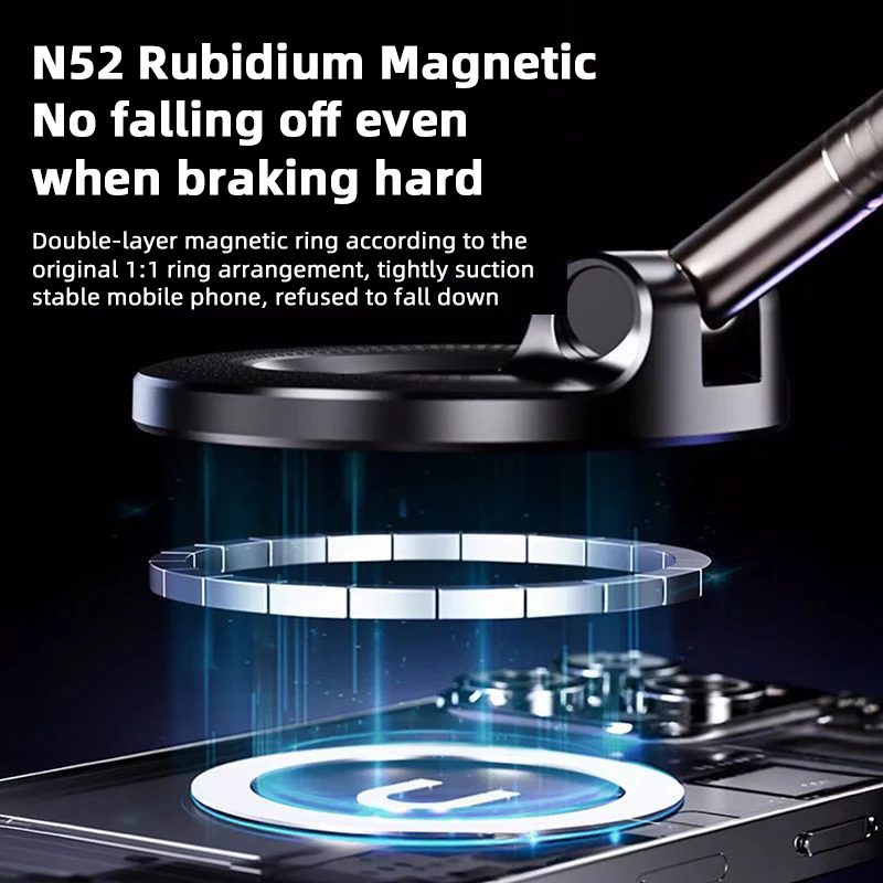 Tecnologia magnética de neodímio N52 **: Adota um design de anel magnético de camada dupla, seguindo estritamente um arranjo de anel magnético 1:1.Com uma forte força de adsorção, pode segurar firmemente o telefone mesmo durante frenagens repentinas, evitando que ele caia.